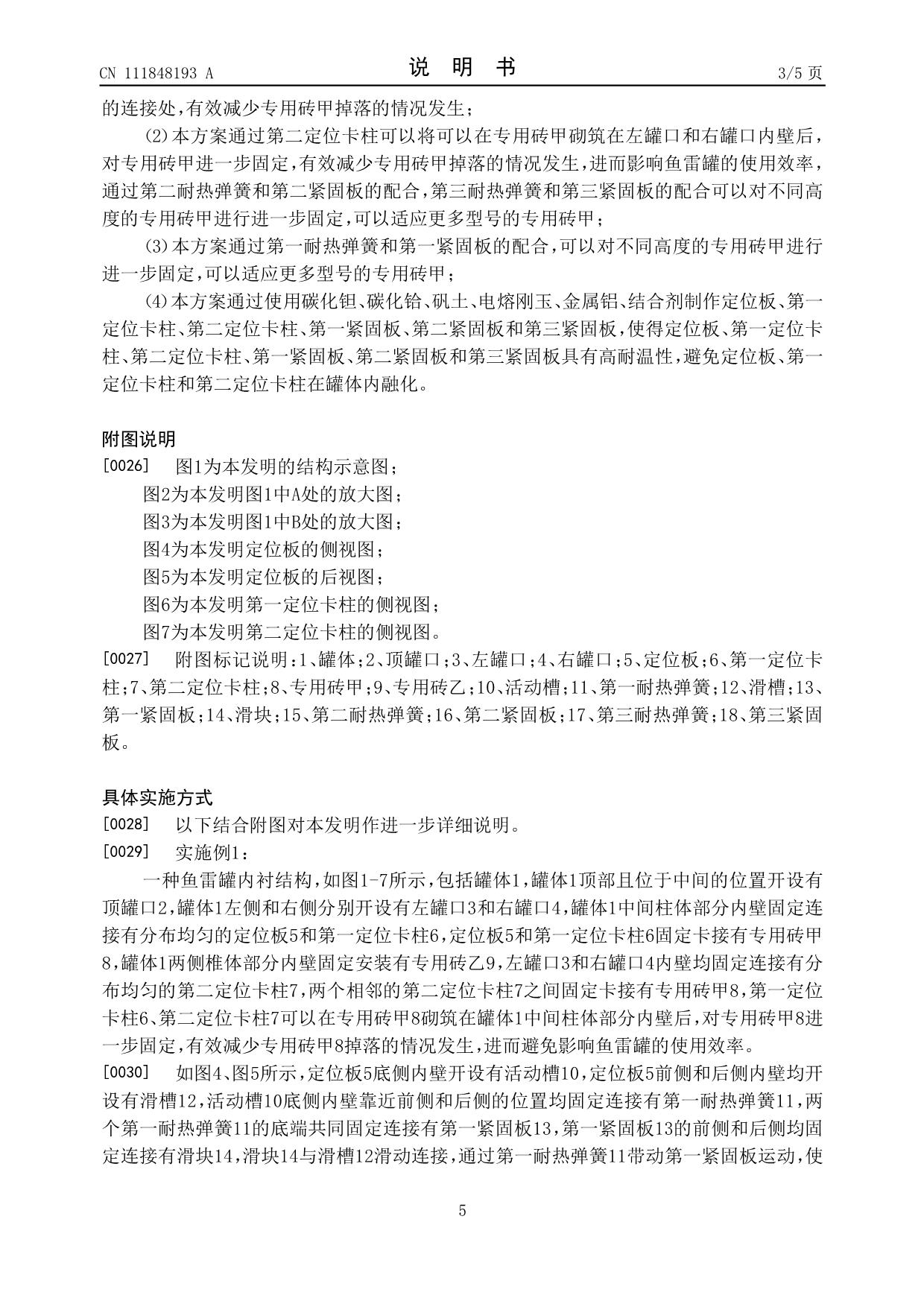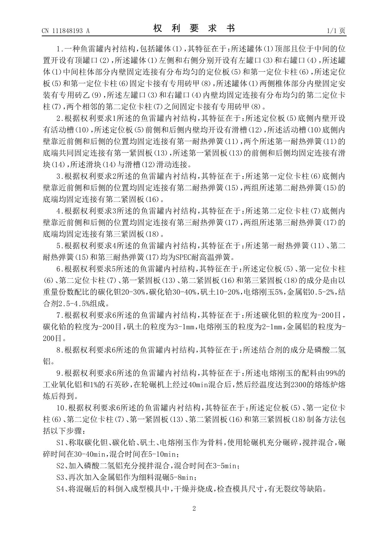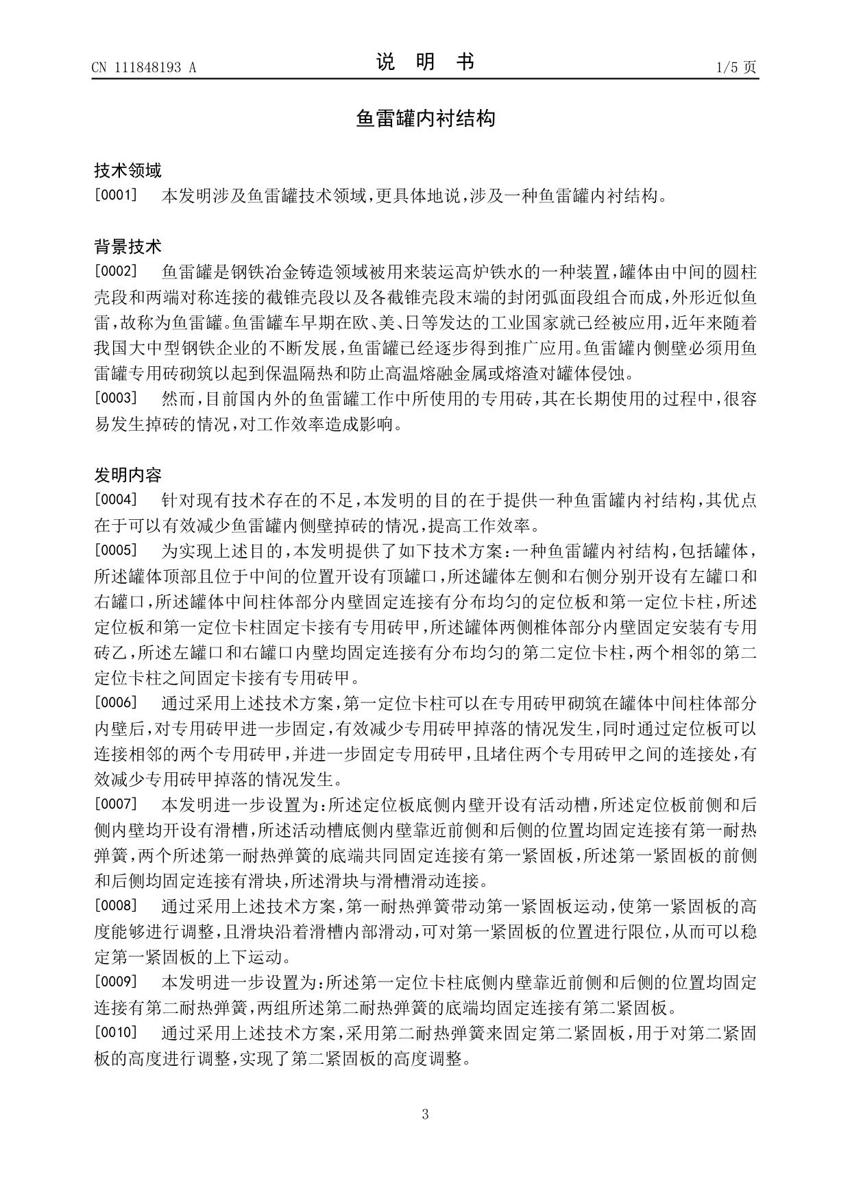 發(fā)明專利——魚雷罐內(nèi)襯結(jié)構(gòu)